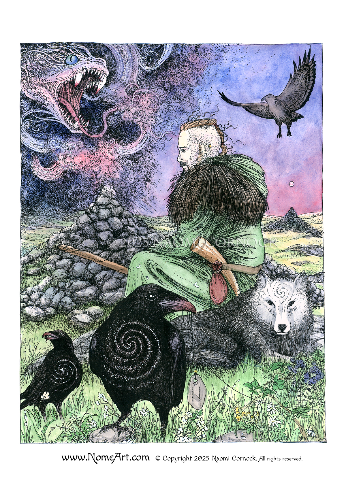 As Heimdall’s Aett begins the hunter grounds himself, stoic and all his senses heightened and attuned to the environment around him. He opens and extends his awareness aided by knowledge (the Ravens), farsight (Buzzard) and survival and resilience (wolf)… with all his acquired skills and knowledge he is equipped to meet the coming storm.